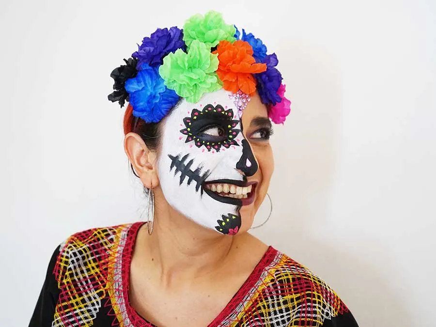 Por eso es que visitamos a Brenda Coral, peluquera y maquillista, quien nos ayudó a hacer un disfraz de Catrina súper sencillo. Una de las ventajas es que solo se aplica en la mitad de la cara, por lo que te ahorrarás mucho trabajo.