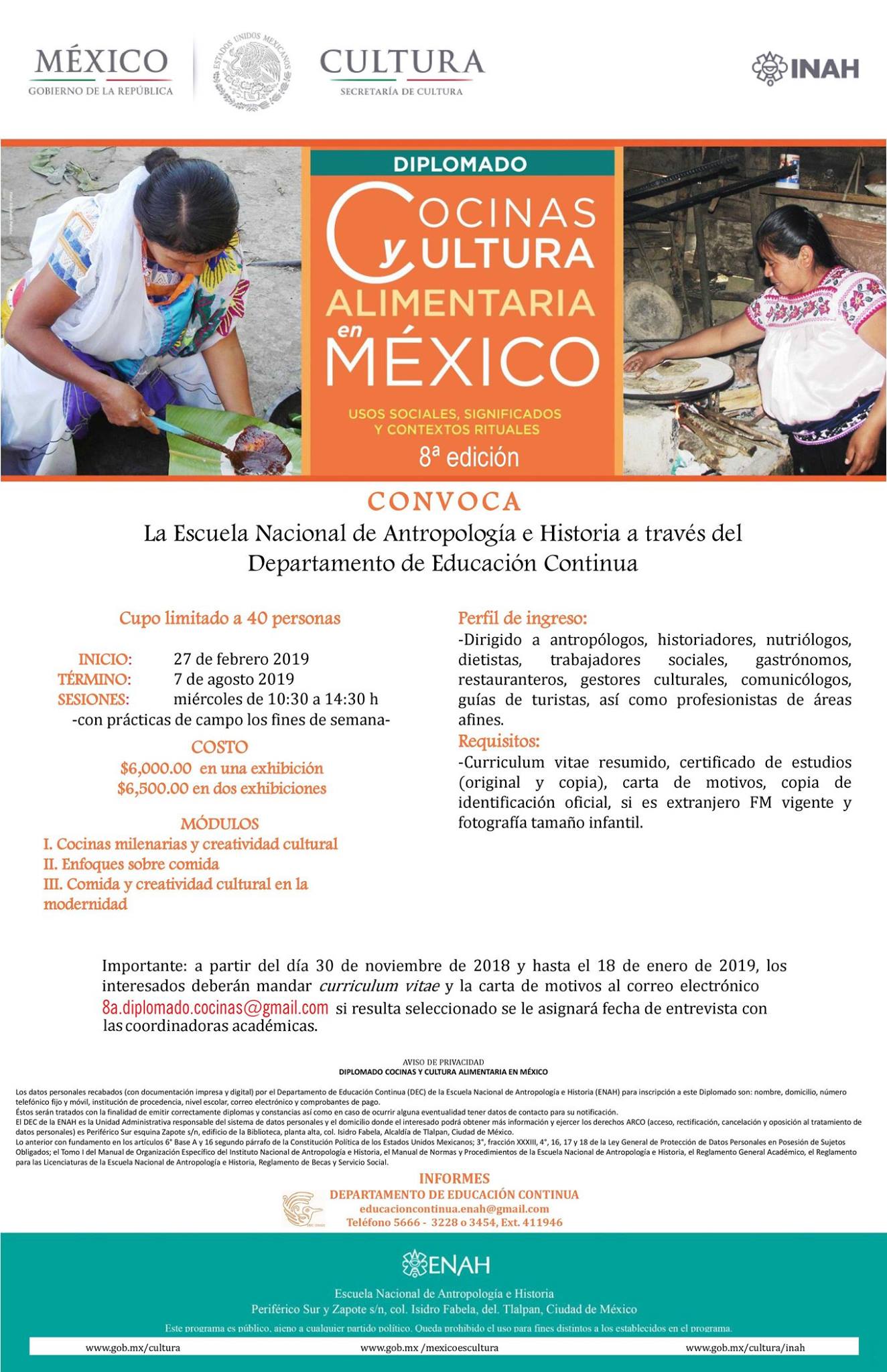 Si te interesa tener más herramientas para conocer las cocinas de México te recomiendo que este 2019 curses la octava edición: se realizará en la ENAH, del 27 de febrero al 7 de agosto. Las inscripciones están abiertas y finalizarán el lunes 18 de enero (el cupo para el programa es limitado a 40 personas). Las sesiones del mismo se realizan los miércoles, de 10:30 a 14:30 horas (y se realizan prácticas de campo los fines de semana).