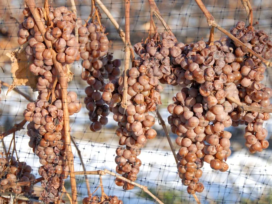 Los granos de la uva vienen concentrados por el frío extremo de las que se obtienen unas cuantas gotas que dan lugar a un mosto muy azucarado.