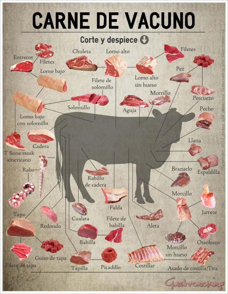 Te compartimos estas infografías que elaboró el blog Gastroming para que aprendas cómo se llaman los cortes de la carne de cerdo, res y de pollo.