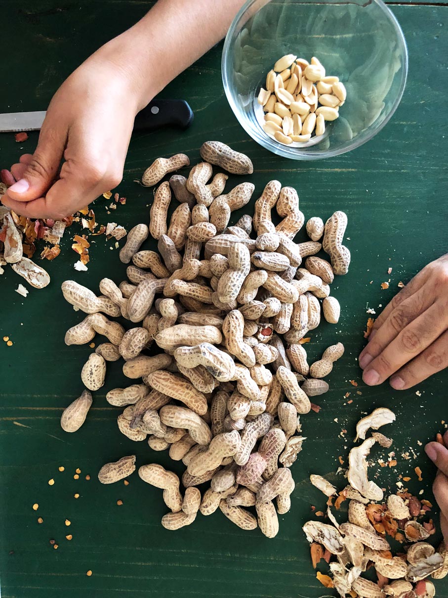 Después de quitarle las semillas a los chiles hay que freírlos. Es un ritual de paciencia pelar y tostar cacahuates, moler el chocolate, dorar en aceite las galletas, las pasitas y la canela, mezclar todo en el caldo y mezclar todo poco a poco en licuadora. Se va probando y ajustando sabores. El café también se machaca y se agrega. Le da otro toque.