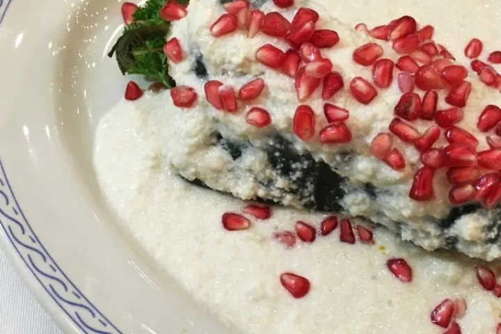 El de este sitio emblemático en la restaurantería mexicana se sirve “encueradito”, su relleno lleva carne de res y se puede notar el sabor de todas las frutas y el balance del chile y la nogada.