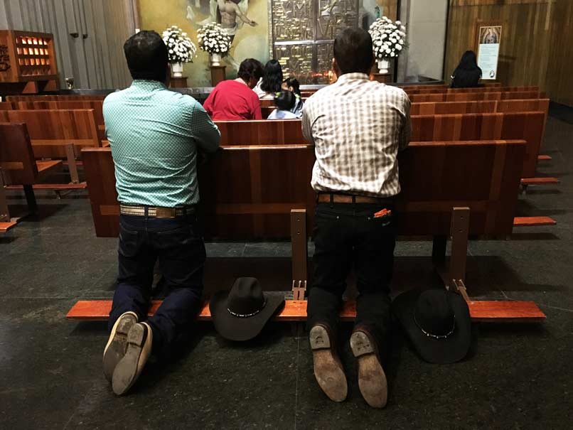 Cuando ambos hombres entran a estos templos se van directo a rezar. Se quitan sus sombreros negros como una muestra de respeto y se hincan a orar. Mientras la misa sigue su curso en la Basílica Nueva ellos hacen su propia plegaria. Dos veces desean pasar frente al ayate de Juan Diego al fondo de este recinto. Se suben boquiabiertos a ese pasillo eléctrico envuelto en fe. “De lejos se ve más grande”, expresa Leonardo después de tomar algunas fotografías.