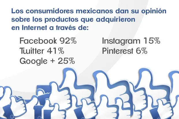 Los consumidores en línea aprovechan estas redes para emitir su opinión sobre los productos que adquirieron y el proceso de compra que obtuvieron con esa tienda. El 92% se expresa por medio de Facebook; el 41% en Twitter; 25% en Google+; 15% en Instagram y en Pinterest el 6%.