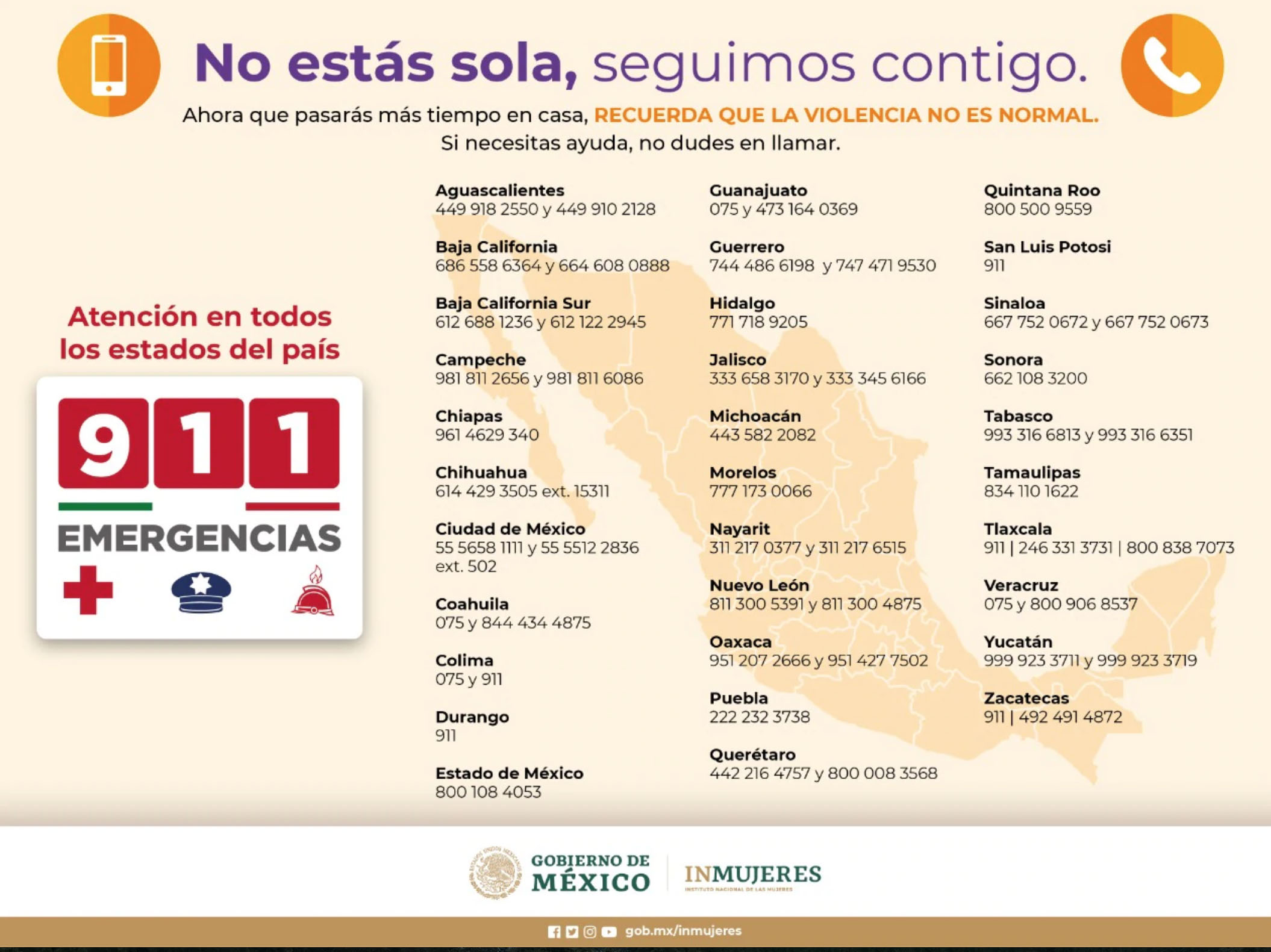 El Instituto Nacional de las Mujeres (Inmujeres) pone al alcance el número 911 como una de las vías para recibir llamadas para atender emergencias que tengan que ver con violencia hacia las mujeres, abuso sexual, acoso u hostigamiento sexual, violación, violencia de pareja y violencia familiar.