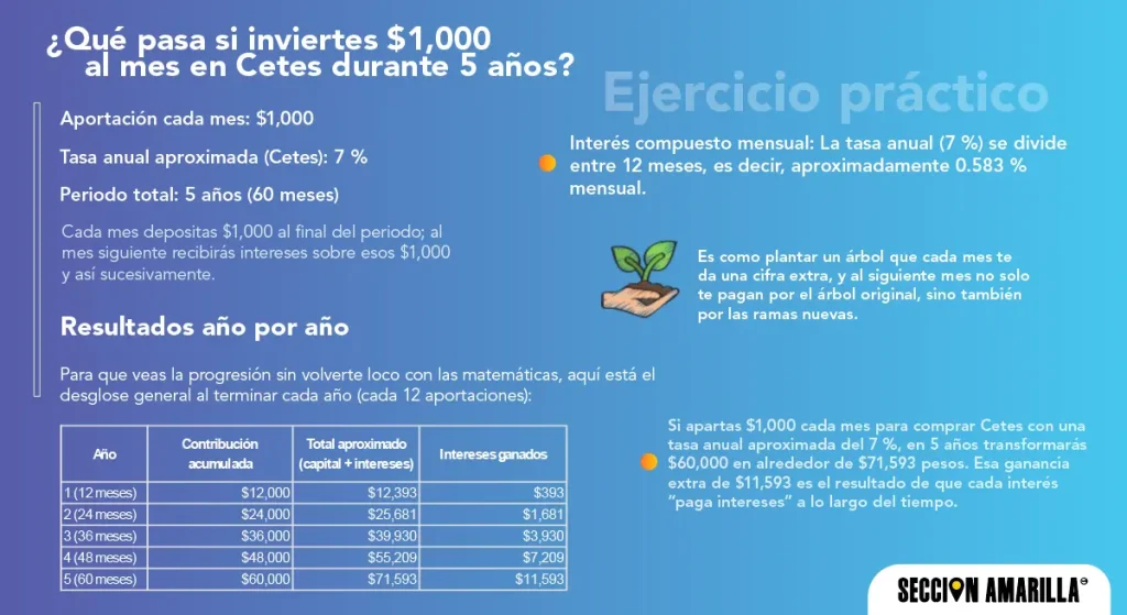 Supón que abres una cuenta en Cetes Directo (la plataforma del Gobierno federal para invertir en Bonos Cetes) y decides destinar a inversión $500 cada mes. Con una tasa conservadora de 7 % anual promedio, al finalizar cinco años podrías tener más de $38,000. Si comparas esto con guardar el dinero debajo del colchón, te das cuenta de que el interés compuesto hace que tu dinero trabaje por ti.