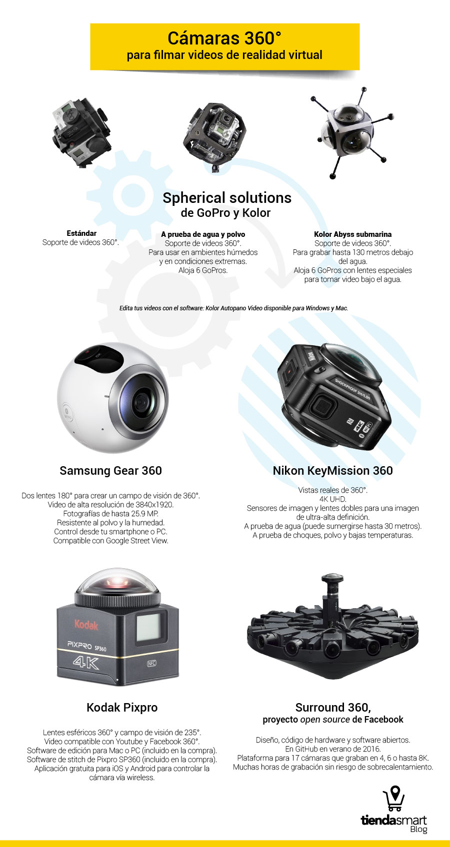 Nikon, Kodak, Samsung y otras muchas compañías ya tienen equipos a la venta que permiten filmar de origen en 360 grados, así como programas de edición para videos con estas características. Además, tienes la opción de armar tu equipo de filmación 360 utilizando varias cámaras tipo GoPro para conseguir capturar todo el entorno. Te damos aquí algunas opciones: