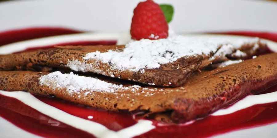 La crepa especial crepa de chocolate rellena de crème brûlée con fresas y salsa de jamaica está hecha especialmente para que vengan a festejar con su pareja no sólo el 14 sino todo el mes.