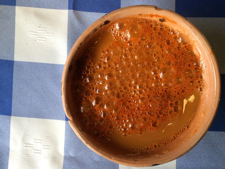 Esta bebida se hace en San Antonio Cuajimoloyas, pueblo en la Sierra Norte. Lleva axiote, pinol de maíz y cacao. Se bebe sobre todo en las bodas. Se suele acompañar por pan de trigo y tortillas de papa, elaborados con la masa de ese tubérculo. Marta Contreras Luna, Epifanía Martínez y Marta Contreras López son tres de las cinco mujeres de Mujeres de la Sierra que me enseñaron a prepararlo.