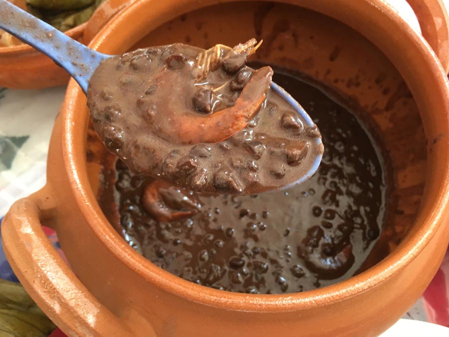 Simona y Pedro López, de Santa María Zacatepec, son tacuates de la Mixteca de la Costa. Ellos cuentan que esta delicia tiene camarón seco que se hierve con el frijol de la temporada de cosecha. Se le agrega a ambos la molienda de chile verde, cebolla y ajo para dar sabor. Se acompaña con una tortilla embarrada de salsa agria, que lleva chile costeño, ajo y limón, todo martajado, con la peculiaridad de que esta salsa puede durar un mes sin echarse a perder.