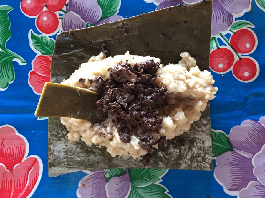 Es típica para las bodas y las crudas dominicales. Se conforma por maíz quebrado, manteca y sangre (moronga). Se coloca en una penca de maguey, que es el plato, y se te regala un pequeño trozo de esta planta que usas como cuchara, y acompañas con tortillas hechas a mano. Su consistencia y sabor ferroso pueden ser extraños para algunos, pero es mejor que no te quedes con las ganas. La disfruté en Barbacoa Panchita en Nochixtlán, en la Mixteca.
