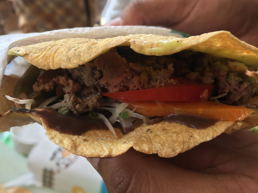 La salchicha de Ejutla de Crespo, en Valles Centrales, es un embutido de res que refleja la herencia europea en la culinaria de este estado. Esta tostada es muy común en el mercado de esa localidad y se prepara en una tostada con guacamole, una salsa endiablada, rajas, verdura encurtida y trozos de queso de puerco. Anel Hernández viene de una familia en la cual desde su bisabuela se mantiene la tradición de elaborar de forma artesanal los embutidos y la carnicería. Además de la sazón de especias y su toque personal, uno de sus secretos es que se elabora a la leña.