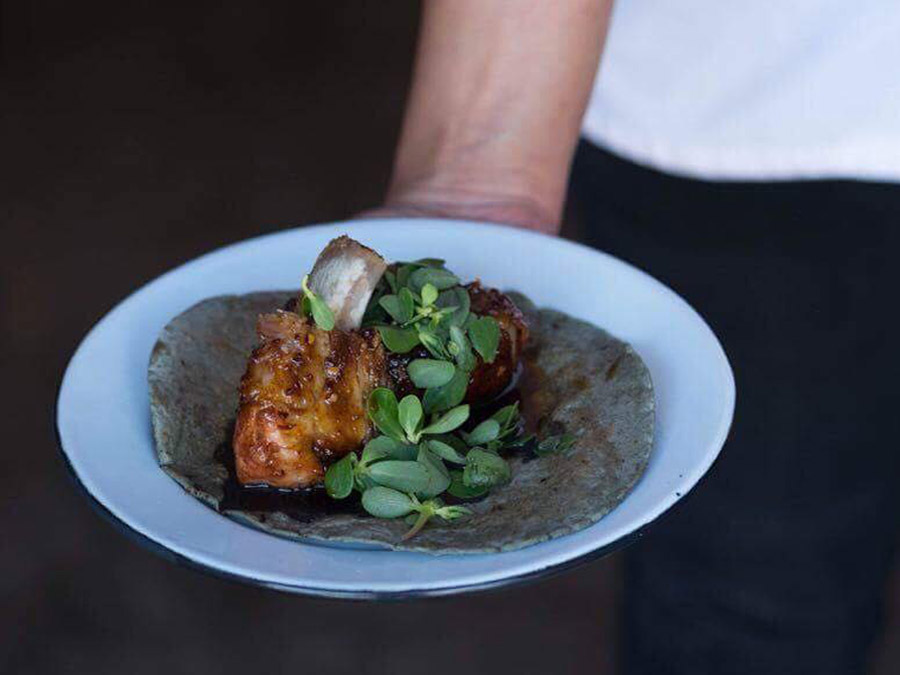 Estos tacos al humo en la colonia Del Valle me fascinan porque son creativos y sabrosos para babear y consentir al antojo. Tortilla azul suavecita y varios rellenos. Tengo tres preferidos: el de costillitas glaseadas en morita y piloncillo, chilmole y verdolagas; el de pork belly, con puré de ajo confitado, rábano encurtido en limón, con un toque de chile serrano; y el vegetariano con berenjena a las brasas y los mismos añadidos del de cerdo.