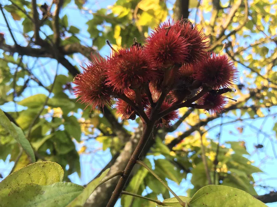 - Este arbusto mide de 2 a 5 metros de altura y su corteza es lisa y café. Las flores son rosas o blancas en racimos. Su fruto contiene alrededor de 50 semillas cubiertas por una pulpa de consistencia viscosa y color anaranjado que contiene carotenos, uno de los cuales es la bixina que sirve como colorante natural.