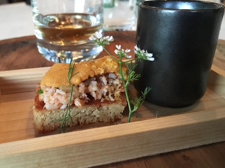 [wt-tip]Brioche con centollo, erizo y yema de huevo curada, con reducción de centollo y jerez manzanilla.[/wt-tip]