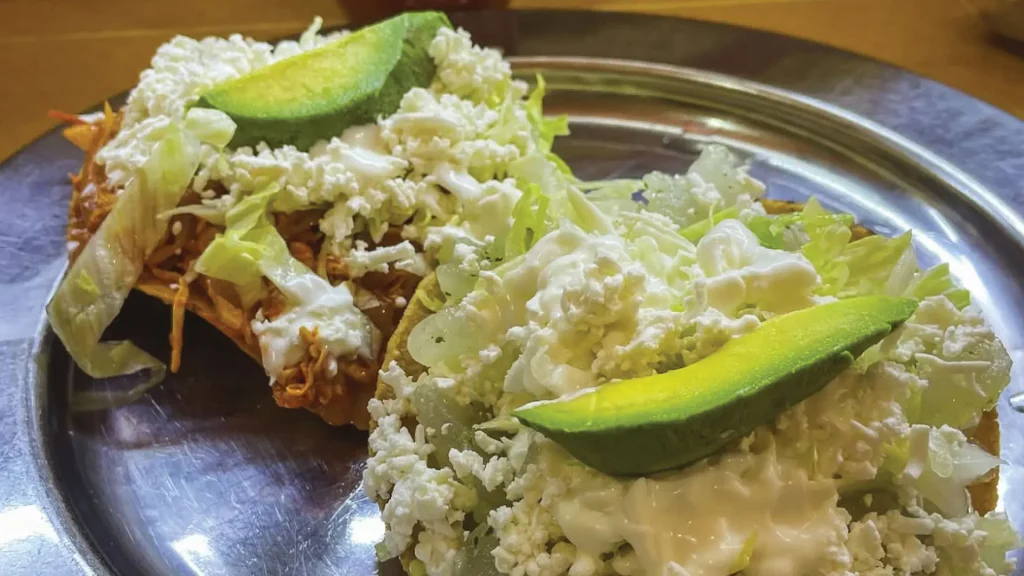 - Reseña: ¿Te imaginas un chicharrón de cerdo preparado con lechuga, jitomate, aguacate, queso y crema? Pues existe y es una delicia. El chicharrón es crujiente y la combinación de sabores te dejará con ganas de más. Es un antojito que se come en un minuto y que te deja con un sabor de boca que no olvidarás. El costo de una porción es de aproximadamente $50 pesos.