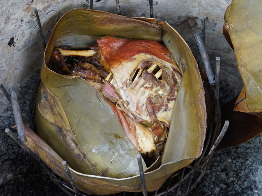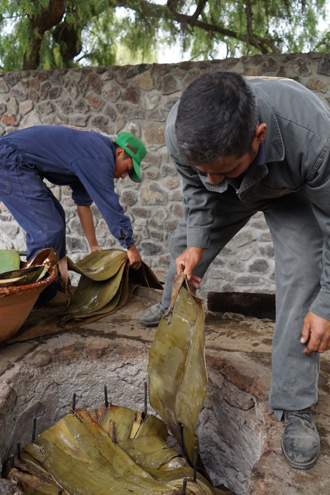 Utilizan un artefacto llamado “mano de chango” con el que escarban los troncos que ya se convirtieron en carbón, echan de lado la merma y meten las pencas en todo el contorno circular del horno. Luego, introducen la tina con el preparado del consomé, una parrilla metálica, encima un forro de penca y luego la carne, a la que se le unta antes sal de grano.