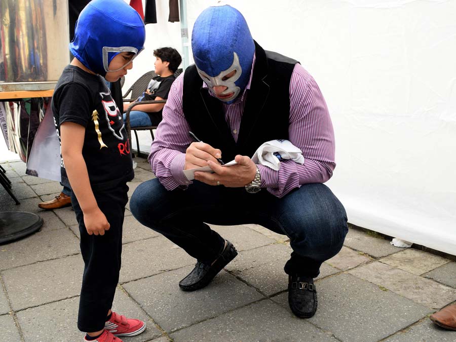 Niños disfrazados como él, jóvenes con pósters ansiosos por tener un autógrafo suyo y gente de todas las edades, hacía fila para recibir uno de estos bocados de maíz y platicar unos minutos con su ídolo, el hijo adoptivo de la leyenda Blue Demon que cuida su legado con trabajo duro.