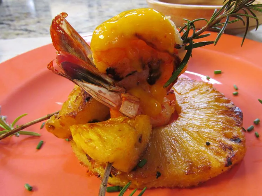- Arma las brochetas insertando un camarón y un trozo de piña en cada rama de romero.
