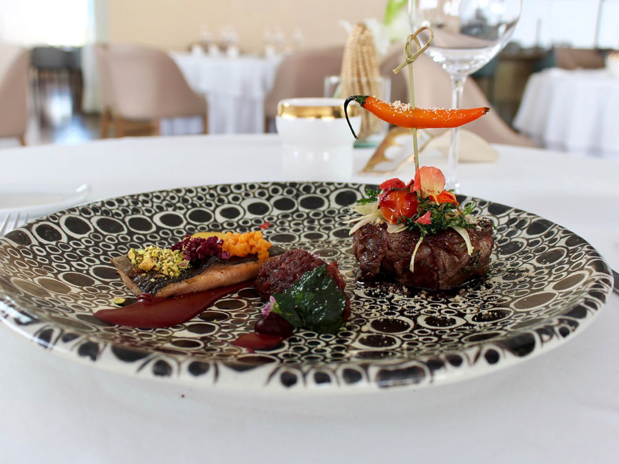 Salsa de vino tinto, mantequilla de frutos rojos, salsa de camote morado y amarillo, verduras salteadas