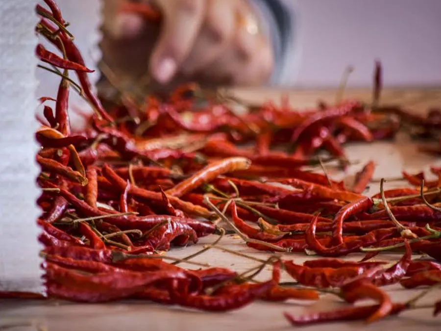 3. Se secan sobre plástico bajo el sol y se tapan por las noches, ya que no se pueden mojar. Durante el secado se realiza la selección de los mejores chiles y luego se empacan.