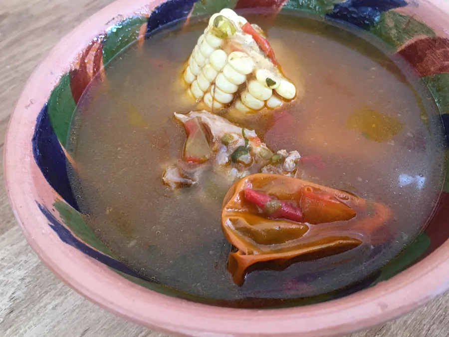 - Sirve el caldo con un trozo de carne, elote, calabaza y un chile entero.