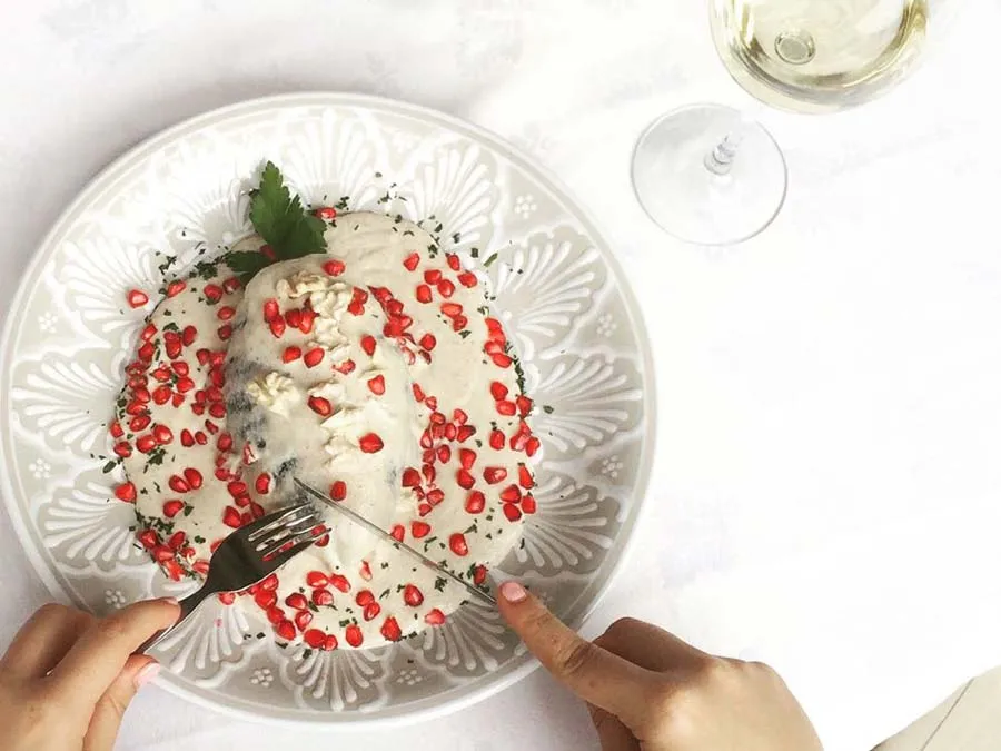 No lo sirven capeado y la nogada se sirve tibia para mantener el equilibrio de sabores. Su relleno es agridulce, con piñones, durazno y más.