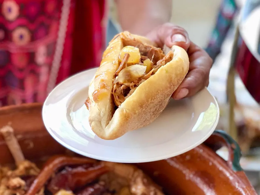 Este antojo se consume en la Costa Chica, Costa Grande y Acapulco. Se conoce como torta de relleno y está hecha con un bolillo fresco y suave, de textura muy similar a la del birote tapatío para las ahogadas, que se rellena con este guiso elaborado con cerdo, especias, chiles como el guajillo, frutas como la piña, y más secretos. La carne se hornea en barro durante al menos 12 horas, de ahí que se deshaga de suave. Lleva papas y zanahorias pero si le agregas un poquito de aguacate, chiles en vinagre y mayonesa tienes un jugoso bocado de lujo (y es el que ilustra la portada de este texto).