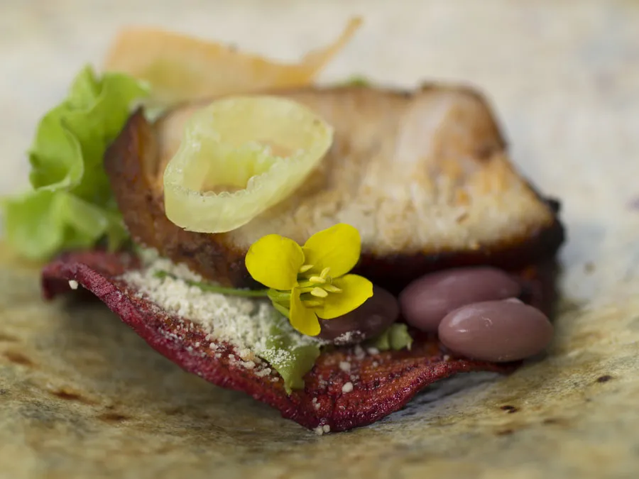 - Montaje: coloca la tostada en un plato y agrega los frijoles, el betabel, la lechuga y el lomo de cerdo. Adorna con el puré de zanahoria y espolvorea con queso seco.