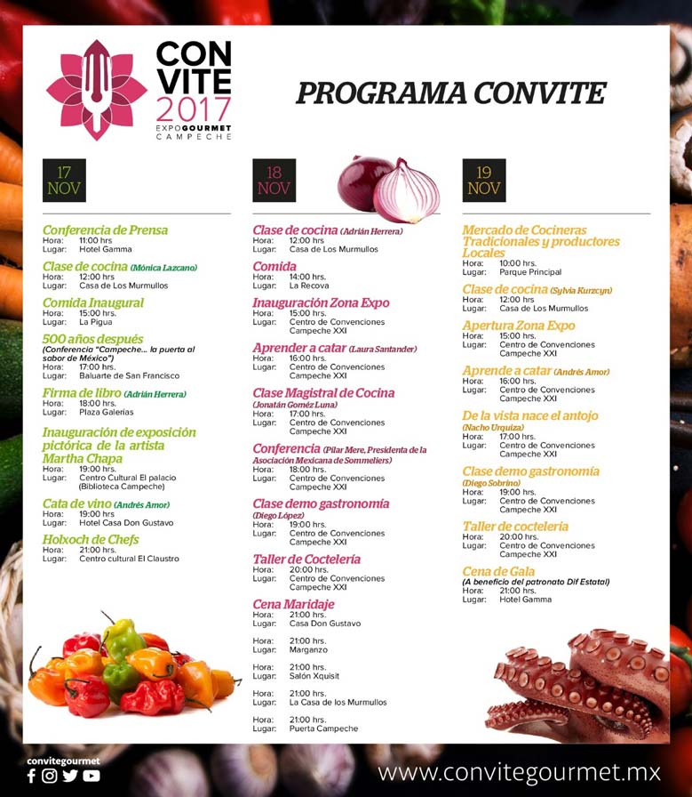 Con la intención de compartir las bondades que tienen en Campeche, el chef Patrick Cros ideó este festejo gastronómico el año pasado, al que invitó a diferentes amigos y cocineros. Convite Expo Gourmet tendrá su segunda edición, del 17 al 19 de noviembre de 2017, y será una ventana para que se conozca la comida y las posibilidades culinarias de este estado, tanto en lo tradicional como en lo contemporáneo.
