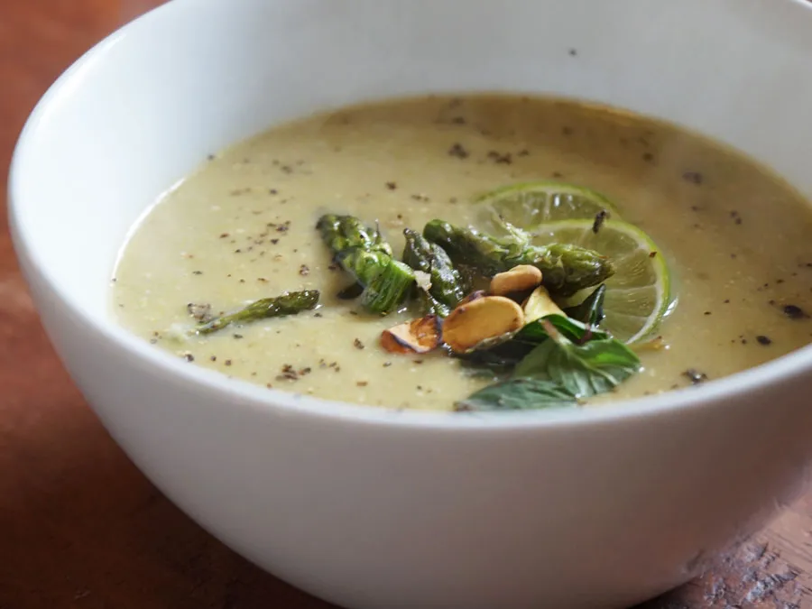 - Sirve y adorna con las puntas de los espárragos, pistaches, hojas de menta y rodajas de limón verde muy delgadas.