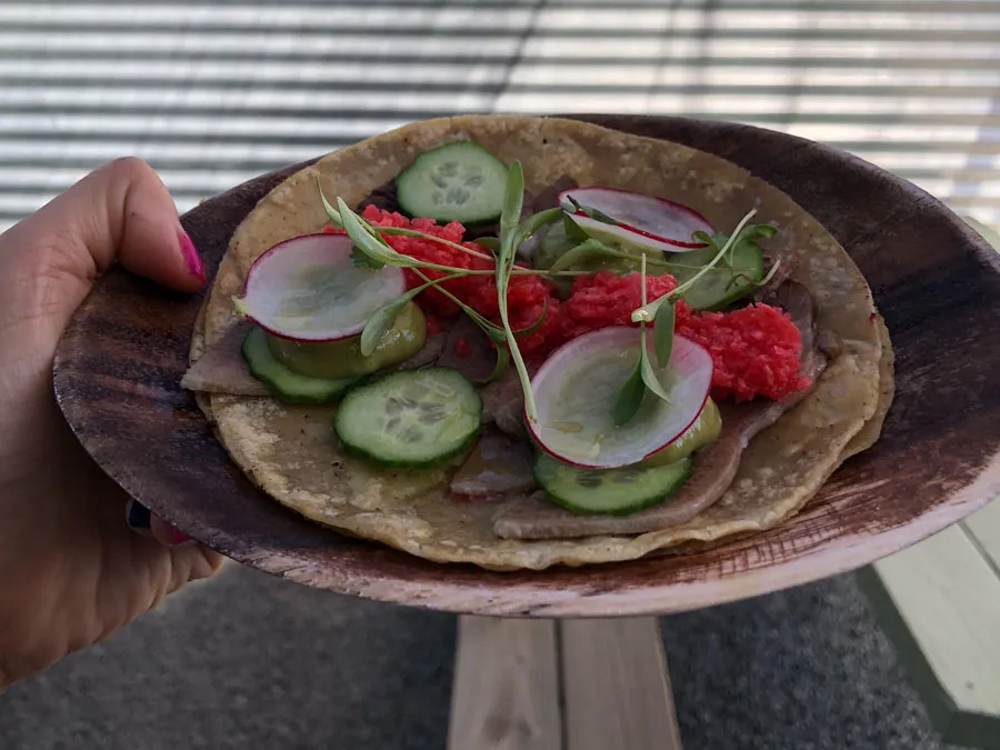 Algunos ejemplos de lo que he comido ahí son abulón con espárragos y yema de huevo ahumada, el colinabo envuelto en masa de maíz criollo de Oaxaca, cubierto con puré rojo que se logra con repollo tatemado, semillas, nueces, chilhuacle y pasilla mixe y; el aguachile de jurel con vegetales tatemados y habanero fermentado.