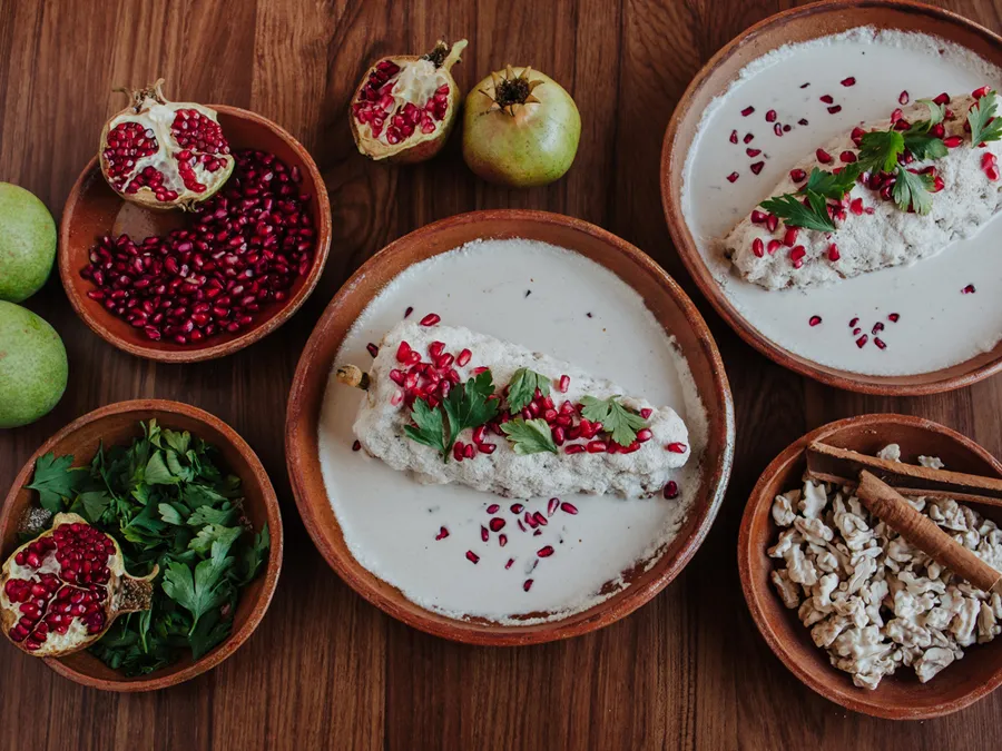 El relleno de los que venden en Carmela y sal es mezcla de carne de cerdo y de res, jitomate, cebolla, almendras, piñones y especias, así como frutos como manzana, granada y durazno. La mitad de la nogada se deshidrata previamente para que tenga un sabor de nuez más intenso, en contraste con el resto que va fresca. Este platillo estará disponible hasta el 30 de septiembre en su restaurante.