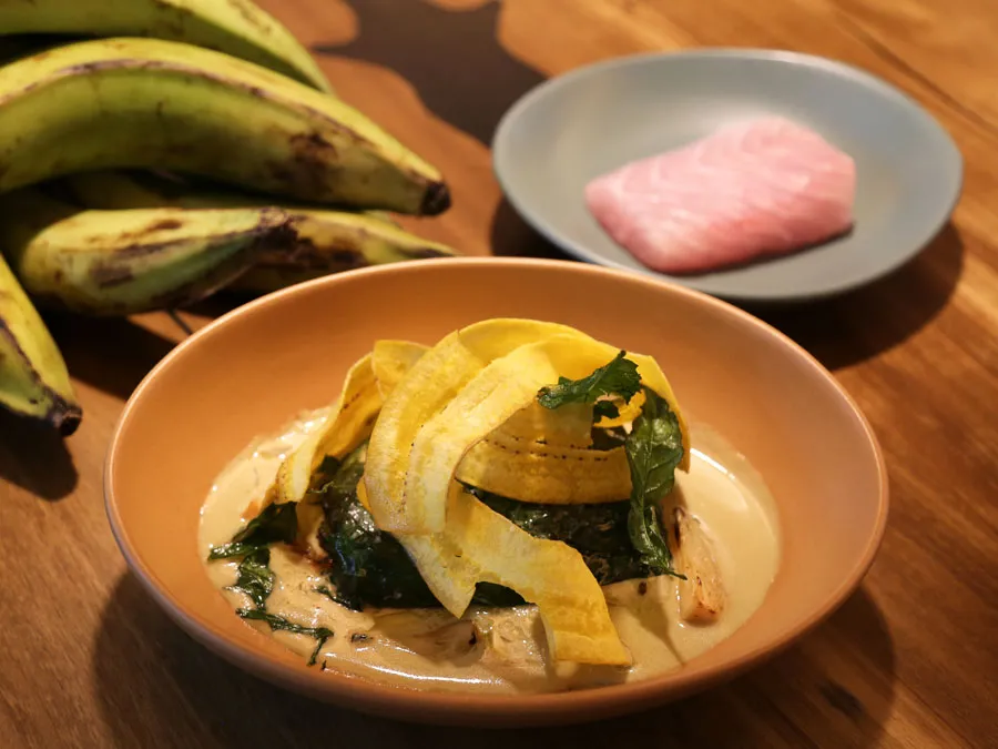 El platillo se prepara con róbalo, cebolla, epazote, plátano macho y hoja santa. La versatilidad de los pescados mexicanos inspira recetas que integran el sabor tropical con ingredientes de tradición.