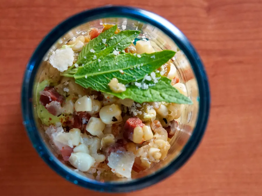- Coloca en un vaso los esquites ligeramente caldosos, agregándoles unas gotas de limón y ralladura de queso manchego, seguido de una cucharada de queso de melón con un poco de chile piquín espolvoreado encima.