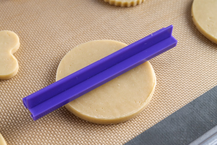 - Corta la masa con tus cortadores. Coloca en la charola sobre el tapete de silicón. Congela durante diez minutos más: esto ayudará a que la galleta no se deforme.