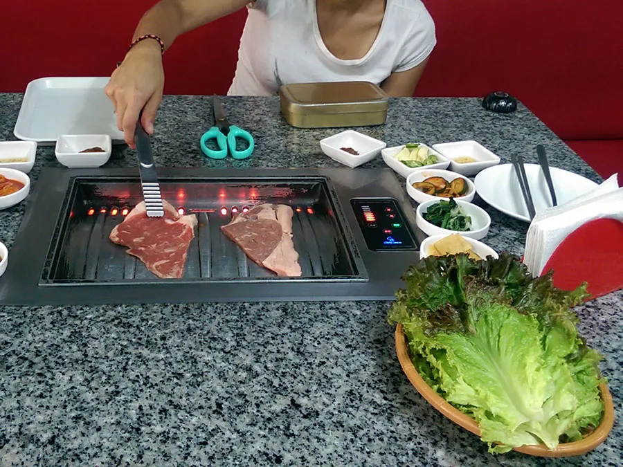 Al llegar me preguntaron si pediría carne y, como quería vivir la experiencia completa, pues dije que sí. Inmediatamente encendieron una parrilla eléctrica incrustada en medio de la mesa. Si quieres impresionar a tu cita y no sabes qué onda con los términos de la carne, mejor practícalo en casa y luego visitas Goguinara.