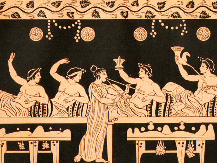 Las pinturas, las vasijas, las esculturas y los escritos griegos y romanos dejaron testimonios de que algunas veces los comensales se acomodaban, tumbados sobre cojines, que bebían vino, comían con las manos y había música y declamaciones durante los convites.