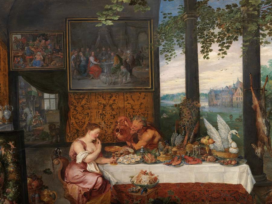 Esta es una de las colaboraciones entre ambos artistas que conforman un conjunto de pinturas que representan la alegoría de los cinco sentidos. En el centro se ve una mesa con delicias, así como a dos invitados, una mujer y un sátiro que le sirve agua en una copa. La pincelada de Rubens se observa en el tratamiento del ropaje de la doncella, de gran riqueza cromática. En la parte superior, hay dos cuadros colgados de las paredes que también son alusivas a festejos de vino y comilonas.