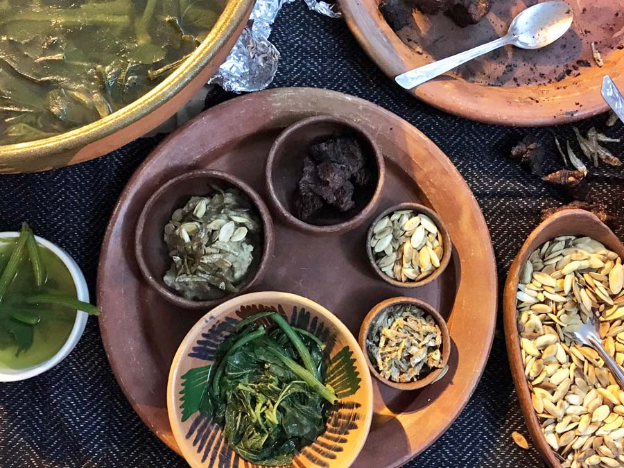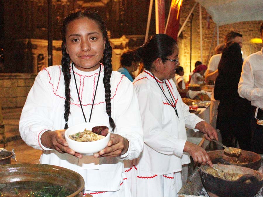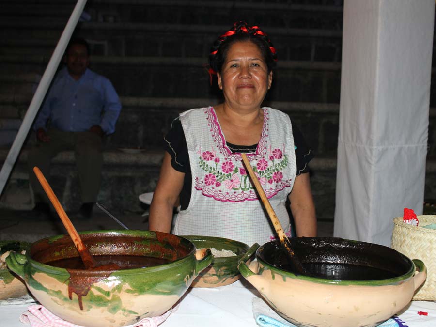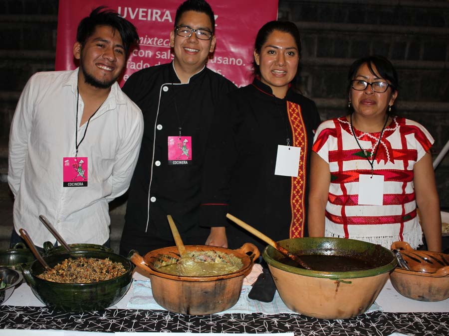 Ix- Chel Ornelas del restaurante El Patio en Tlaxiaco, investigadora, cocinera y conocedora de la cultura alimentaria de su estado, presentó diversas delicias como alcaparrado con lengua, mole con picadillo, chiles rellenos afrutados, cemitas de requesón, pozole mixteco y tamales de amarillo con epazote.