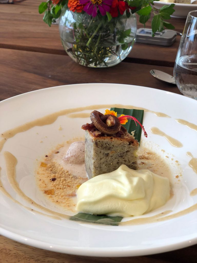 Hugo busca ofrecer sorpresas creativas y ricas partiendo de recetas típicas nayaritas, así como de diferentes inspiraciones culinarias del mundo. Un ejemplo es el postre Plátano borracho, que toma como base el delicioso pan de plátano local (del cual te conté hace tiempo y que nos preparó Betty Vázquez en nuestra visita a San Blas), pero le agrega una salsa de tres leches con mezcal, espuma de rompope, helado de canela y un pedacito de ese exquisito plátano deshidratado que venden en las carreteras de la zona.