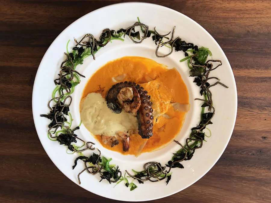Otros ejemplos de platillos que este Hugo presentó inspirado en los insumos de la zona fueron un ravioli de callo de hacha, marlín ahumado y camarón, con salsa de jitomate ahumado y chipotle, con camarón y pulpo a la parilla y espuma de mar, sobre algas marinas de distintos tipos (wakame y kombu frita); y una cola de res con vegetales, un cordero al grill con jitomates del huerto, y un espesado con masa de maíz y chiles “de teñir” y guajillos secos.