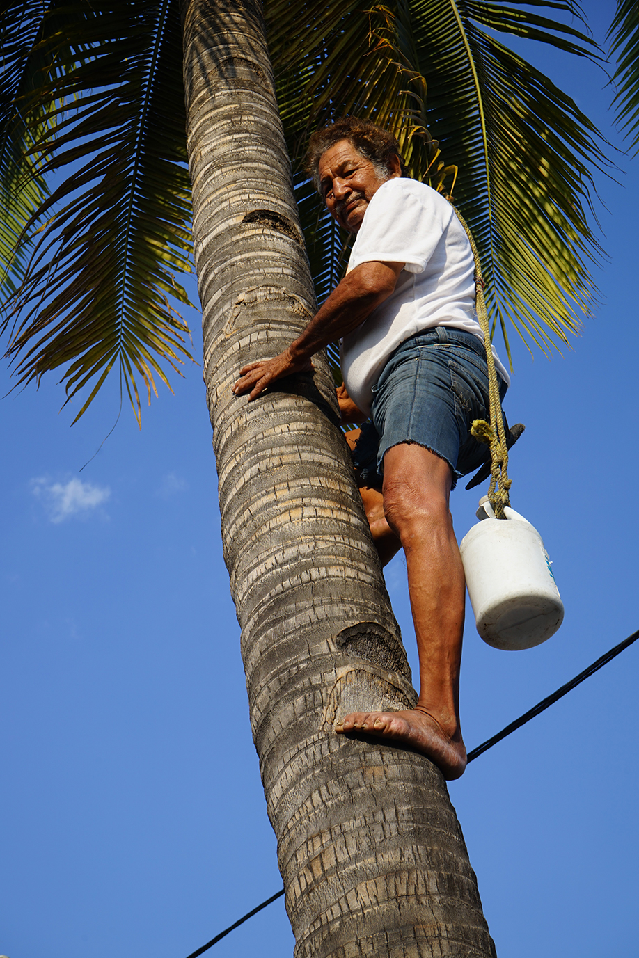 El tubero con el que platicamos es testigo vivo de la importancia que tiene el cocotero para la historia y el presente de esta región. Quizá Leonardo sepa, o quizá no, que existieron los cocos chocolateros, un tipo de taza con recubrimientos de plata que eran muy valiosas como artefacto para el consumo de esta otra bebida, o que las palapas, que es edificación y vocablo a la vez, son de raíz filipina.