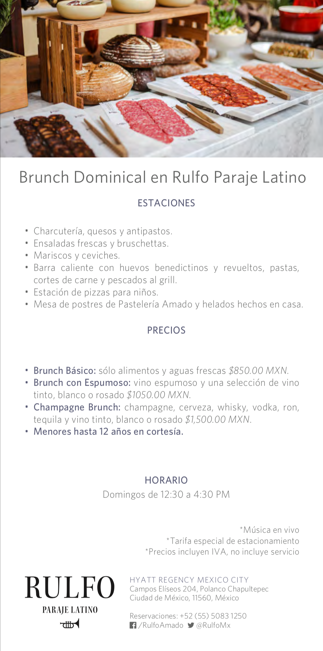 Adicionalmente, el domingo la fiesta puede continuar con el brunch dominical, que se sirve de 12:30 a 16:30 en tres modalidades (que puedes leer en este flyer). Es un pretexto ideal para festejar con exquisita oferta culinaria.