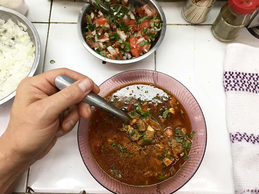 El Ché Barragán es uno de los puestos de birria en el mercado. En su pancarta está la icónica figura del mártir de la Revolución Cubana, El Ché Guevara. También se leen cómicas leyendas que dicen “la #1”, “Atendido por el J.R.” y “Desde 1919 A.C.”. Quizá tuvieron que colocarlas para hacerle frente a sus vecinos birrieros que compiten por la clientela cada día. Si eliges sentarte en El Ché sentirás las miradas de odio de los vecinos pero un taco o un platón de este guiso exquisito y salsa con chile cola de rata, como se le conoce a un picante local, lo vale.