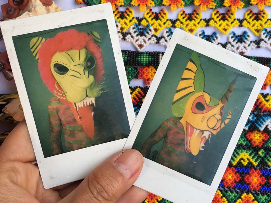 Anselmo Zeferino y Juana González son coras de Jesús María del Nayar. Ellos contaron de La Judea, fiesta de Semana Santa. Estas fotos son de las máscaras que él elabora. Tarda seis horas en cada una. Son un león y un murciélago. Se pintan el cuerpo con pintura de agua y danzan, comen sopa de arroz que preparan en ollas para más de dos mil personas. Tienen cinco hijos, la mayor tiene 19. Su hogar esta a cuatro horas y su camión les cuesta 200 pesos por eso prefieren quedarse en Tepic, vender lo que puedan e irse más tiempo, ya con dinero. No les gustan las fotos y son muy amables. Están en la parte de afuera del mercado y venden collares, pomada de peyote y otras artesanías que elaboran ellos y los huicholes, sus vecinos en ese poblado.