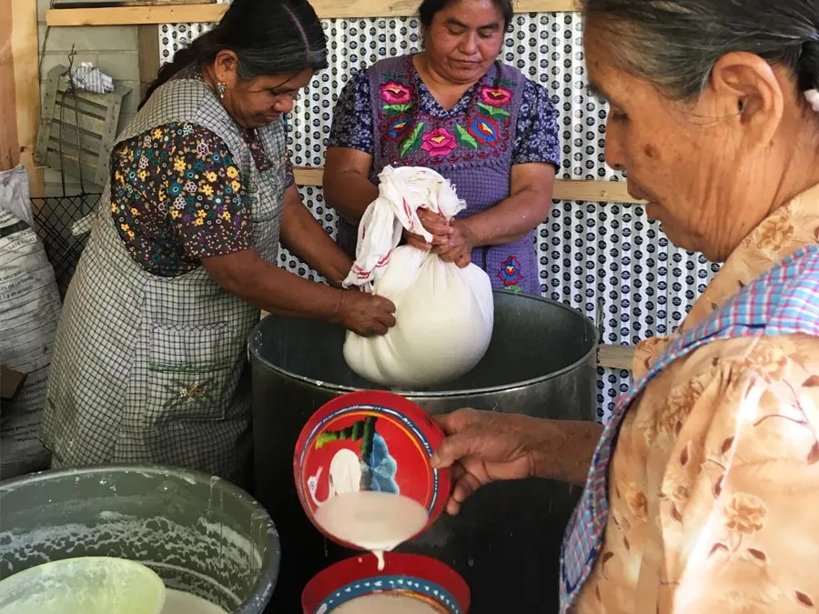 En la foto principal aparecen las mujeres de la familia Navarro de Santo Tomás Jalieza, quienes además de cocinar delicioso, son artesanas reconocidas. En la imagen están elaborando atole blanco y podrás leer más sobre ellas en este blog.