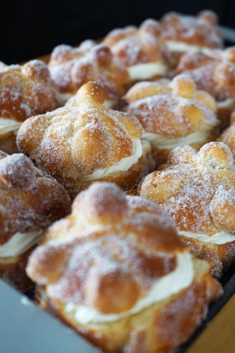 El pan de muerto que más conocemos en Ciudad de México (es decir, el que tiene azúcar encima) debe llevar mantequilla, así que también su olor debe remitir a ella, aunque, por costos, muchos no la implementan en sus recetas. “La mejor forma de saber es que si le das una mordida al pan y te queda un velo grasoso en el paladar, eso es margarina”, explica Kenny. La primera se funde a los 36 grados, que es la temperatura del cuerpo humano; la segunda a los 40, así que por eso queda ese residuo.