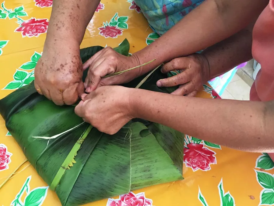 Laura Villalobos, otra cocinera de Izamal, los prepara por encargo para estas fechas, y es que hay distintos tipos de pib. Agustín Colli, su esposo, hace hamacas, mientras las mujeres de la familia dedican sus horas a este envoltorio tan exquisito.