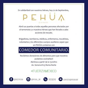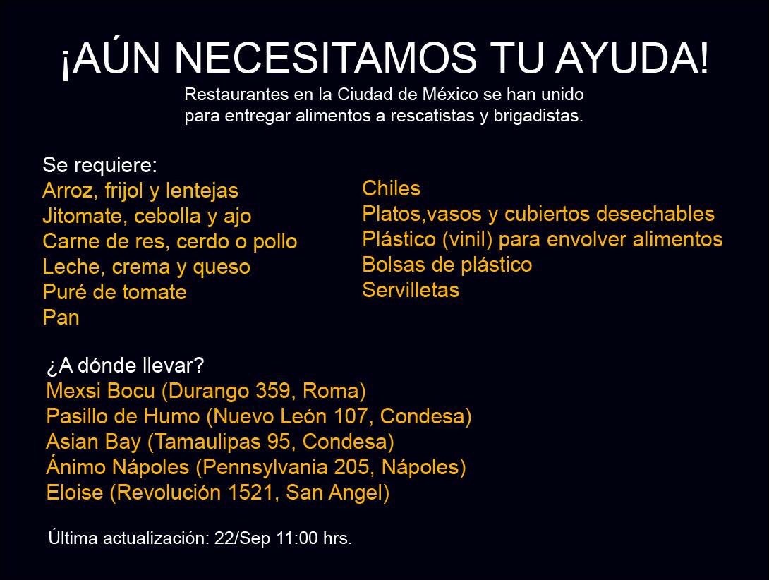 Desde los primeros momentos después del sismo del pasado 19 de septiembre de 2017 varios restaurantes de la CDMX se han solidarizado y han funcionado como centros de acopio, comedores comunitarios y coordinación para la entrega de alimentos a brigadistas.
